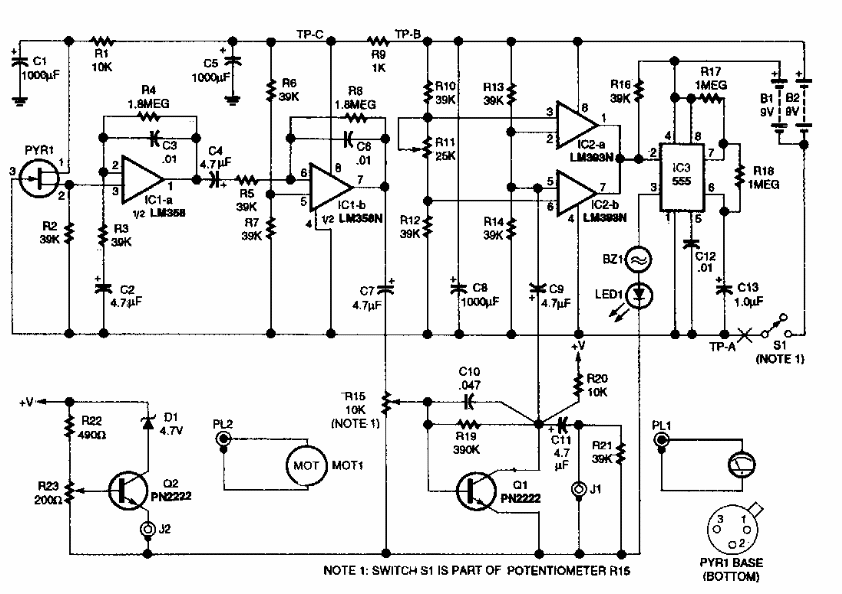This circuit detects the body's heat emissions and can trigger a load, for example, a solenoid or an alarm. The circuit was found at Electronics Now. It makes use of a sensor for the 14u infrared range.