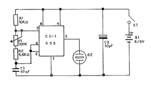 To fit the integrated circuit under test, we used an 8-pin DIL socket. Observe the fitting position of the integrated in the test. The resistors are 1 / 8W or larger and the capacitor is 47 nF. The potentiometer controls the frequency of the sound that the transducer produces. The transducer can be a microphone or crystal or ceramic earpiece. The circuit can be powered either with 4 small batteries or from a 9V battery. To use the device, plug the integrated circuit under test into the socket and turn on the power. Set P1 and the transducer should beep if the integrated circuit is OK.