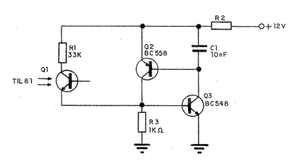 The circuit in the figure is very interesting because it simulates an SCR triggered by light. When the light falls on the phototransistor it conducts and feeds the regenerative switch through Q1. With this circuit, we can obtain a characteristic of negative resistance, which allows its use in the triggering of SCRs and other devices.