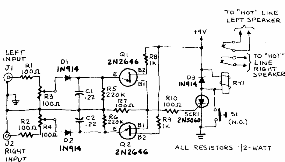 This speaker overload protection circuit was found in Radio Electronics from the 1980s. The circuit uses a 9 V relay but can be powered by 12 V for a relay of this voltage.