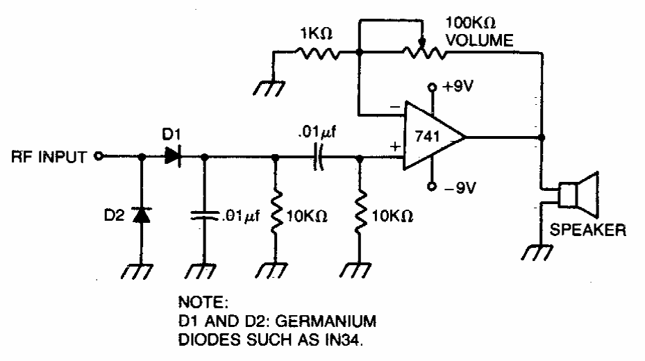 This circuit reproduces in a small loudspeaker the sound of the signal that modulates a transmitter. The circuit works by sampling the signal being transmitted. The speaker is high impedance (at least 100 ohms).
