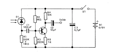 If we modulate a beam of light from an LED, for example, we can receive this beam of light at a distance and convert it back into sound. This is the basis of an optical communications system. The project that we give next is that of a receiver, which must have its output connected to the input of any good amplifier. Any photodiode can be used, and the range will depend on the intensity of the transmitted signal and the existence of optical resources, such as lenses. The fixation of the photodiode in the focus of a scope, for example, allows the extension of the range to more than 1 km in favorable conditions of visibility and at night.