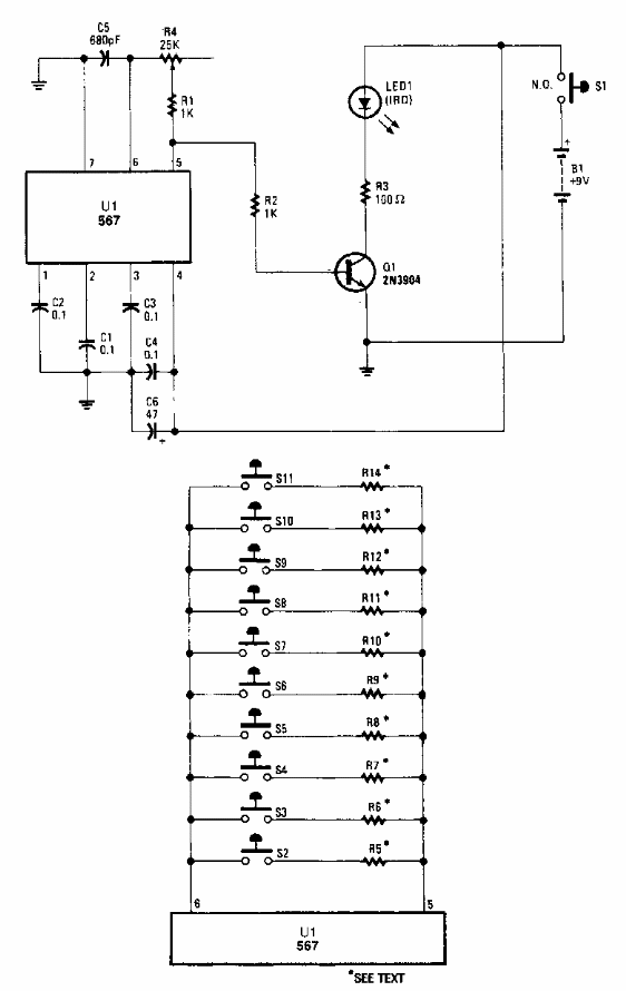 This circuit is from a Popular Electronics from the 90s. The circuit has a tone frequency modulator network based on a PLL567. The number of channels is limited by the selectivity of the receiver.