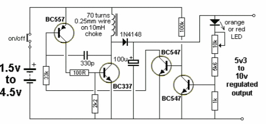 This circuit provides an output of 5 to 10 V at its output from inputs of 1.5 to 4.5 V. The output voltage detects the settings and the load current that is very small in the order of a few milliamps. The circuit consists of a switching source or a boost converter having been found in recent English documentation.