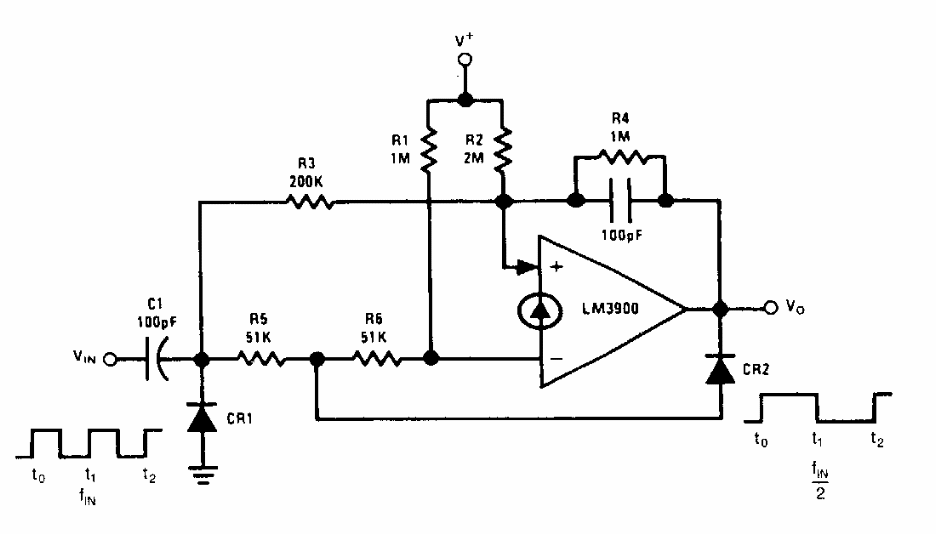 This circuit was found in a National Semiconductor manual from the 1980s. The operational amplifier is from that time and the waveforms are shown in the diagram.
