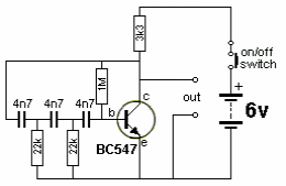 This circuit has a common configuration widely used in projects on this site. The transistor is general-purpose, and capacitors determine the frequency of oscillations. The output signal is sinusoidal.