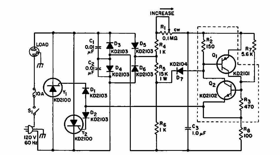 Found in a 1967 RCA manual, this circuit uses components from the era that can be replaced by modern equivalents. The circuit is for resistive loads.