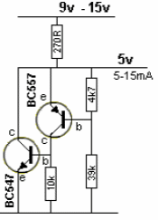 This is a higher current version of the previous circuit, obtained in recent English documentation. With it we can obtain an equivalent circuit for a 5 V zener diode with a current between 5 and 15 mA.