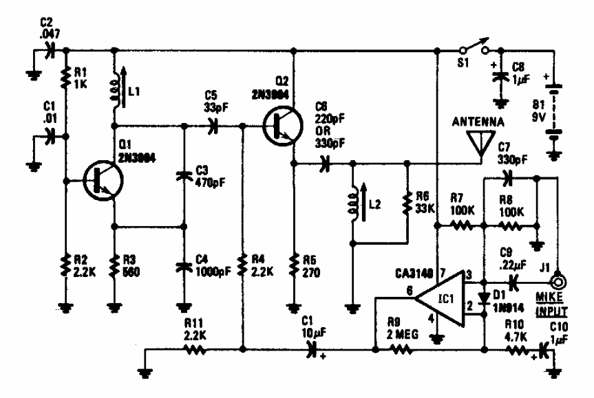 This small AM transmitter was found in American documentation from the 1980s. Transistor support equivalents, as does the operational amplifier. The circuit operates between 800 kHz and 1600 kHz. L1 can have 80 to 100 turns of wire 26 or 28 in a ferrite rod.