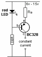 This interesting 50 mA constant current source uses an LED as a reference and the current is basically determined by Re. The circuit operates in the 6 to 15 V range and was obtained in a recent American publication.