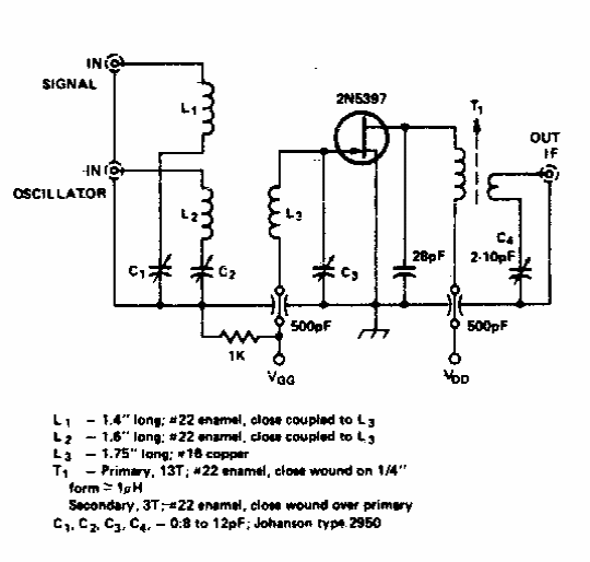 This circuit was found in a documentation from the 70s. The FET admits current equivalents and the frequency of the signals depends on the coils.