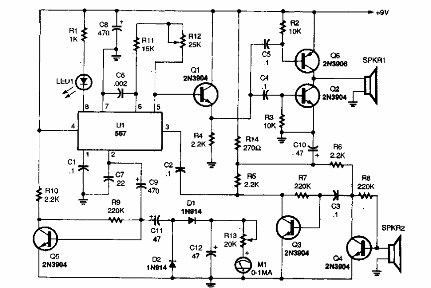 Found in Popular Electronics from the 90s, this circuit is based on a PLL567 and employs high-end or ultrasonic speakers depending on the frequency of oscillations.