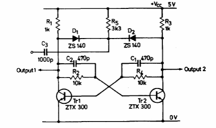 This circuit is from a 1974 Ferranti transistor manual. Transistors are general-purpose types at the time. The maximum switching rate is 100 kHz.