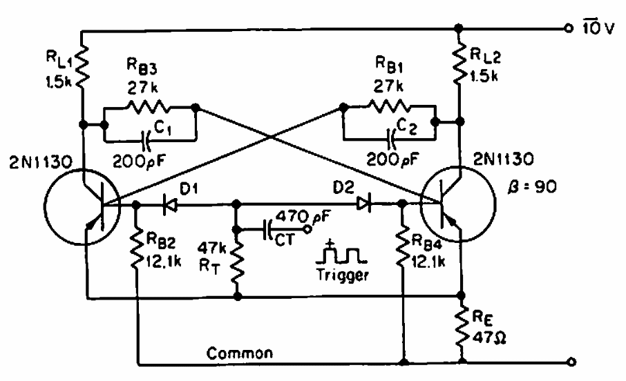Found in American documentation, this circuit can make use of modern equivalent transistors. The circuit triggers with positive pulses.