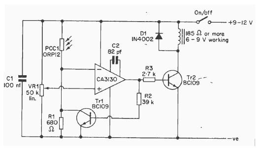 This circuit with the CA3130 has a feedback system that works as a lock. The circuit is from a 1977 publication. The relay is according to the supply voltage.
