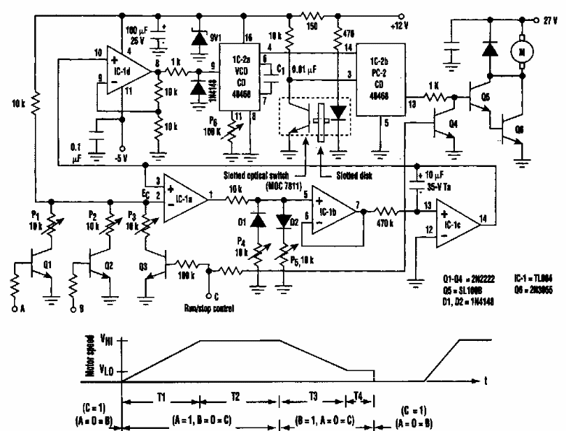 This precision speed control was obtained in an Electronic Design from the 90's. The output final stage power transistors must be in accordance with the motor power.