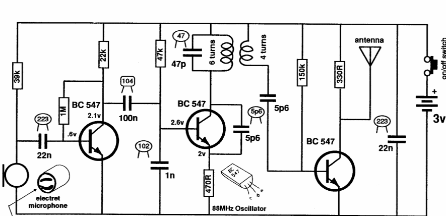 This small FM spy transmitter uses three transistors with an RF amplification stage. We found it in an Australian publication from 1991.
