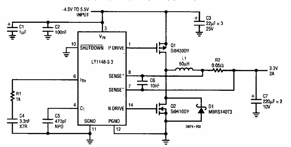 Found in a Linear Technology documentation from the 90s, this circuit dissipates 1.5 W with an output of 3.3 V x 2 A. The integrated circuit used is from the time.