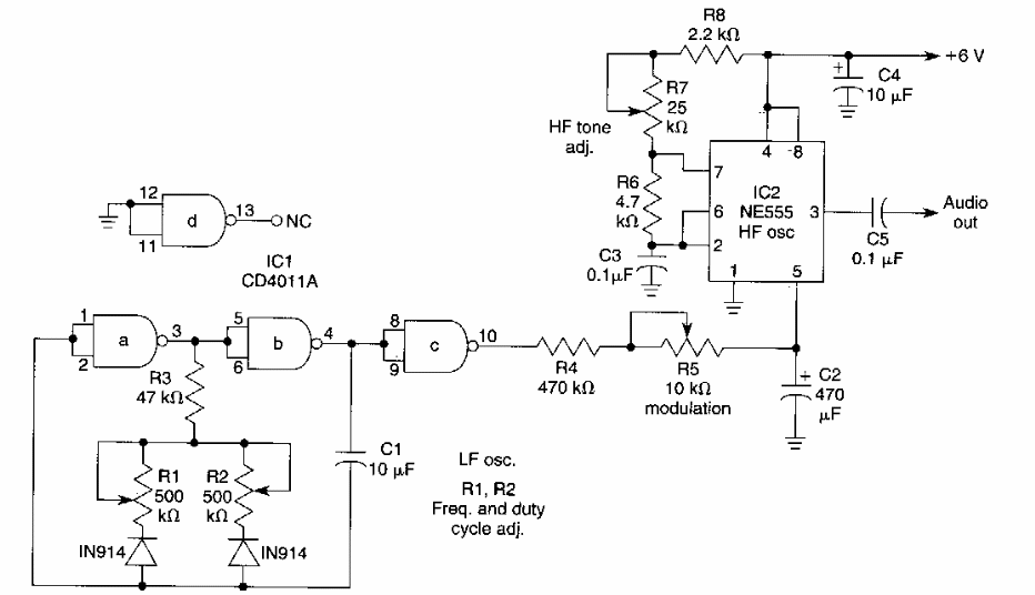 This circuit that emits siren sound can be used in a fire alarm. We found it in an old American documentation. The signal must be applied to a good audio amplifier.