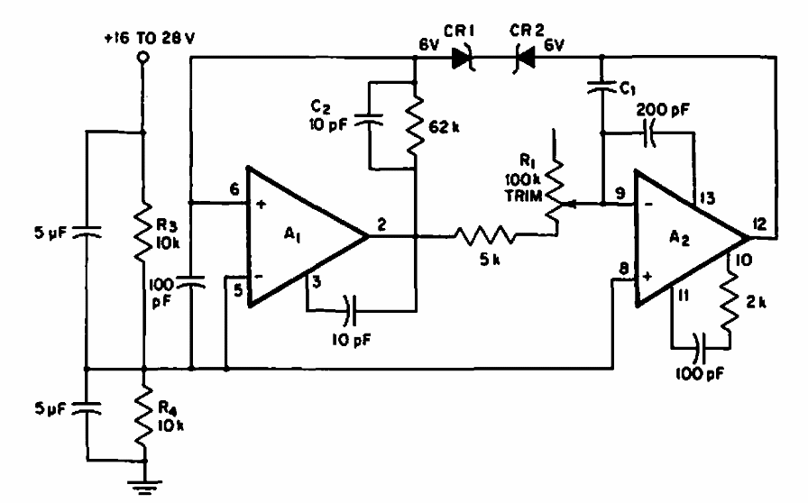 This circuit was taken from an old American documentation. It can be built with modern op amps. The power supply does not have to be symmetrical.