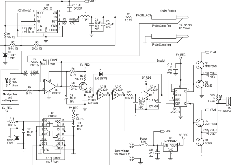 Based on CMOS logic this short-circuit locator circuit uses the ear's ability to detect small changes in pitch, which are caused by variations in millivolts in a track under analysis.