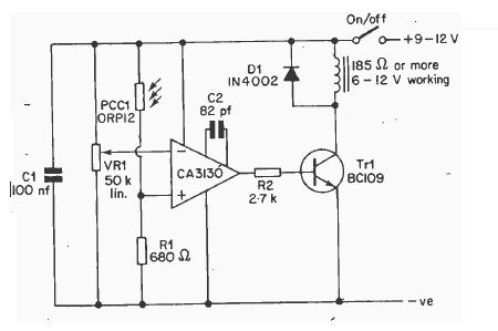 This is the version of the previous circuit with shadow activation. The circuit can use relays from 5 to 12 V and the voltage range can be the same. The circuit is from 1977.