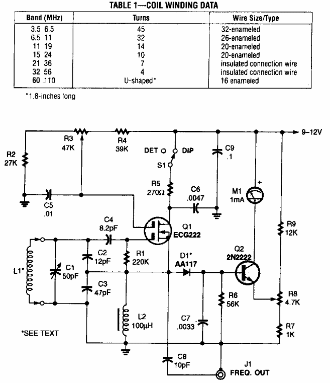 This circuit was found in a Popular Electronics from the 90's. It consists of the solid-state variation of the well-known grid-dip meter. MOSFET is a component not very easy to obtain these days.