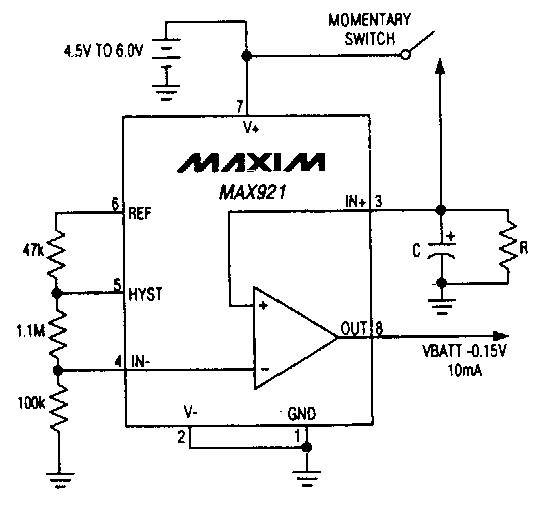 This circuit was found in Maxim documentation from the 1990s. The RC circuit determines the trigger time.