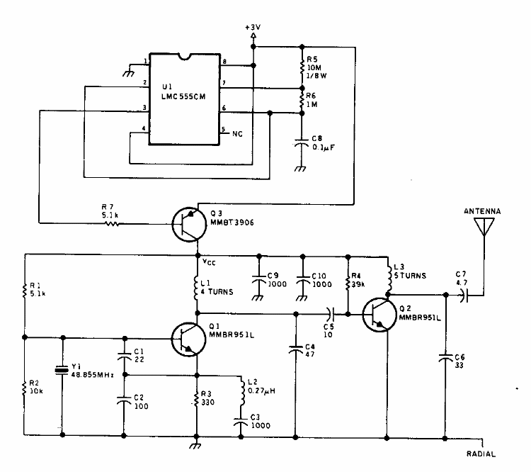 Found in a magazine 73 for radio amateurs from the 90's, this transmitter sends location signals in the VHF band. The frequency depends on the coil, being between 54 and 100 MHz for 5 turns of wire in the form of 0.5 cm without a core.