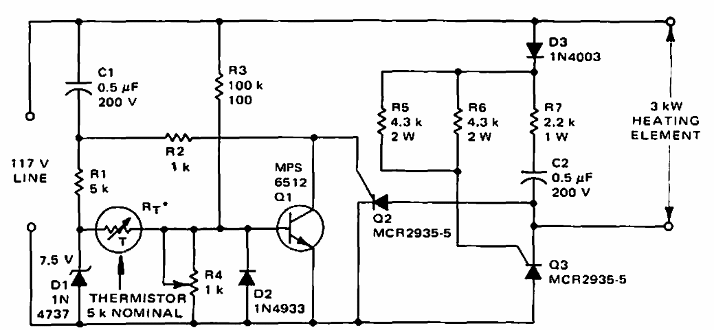 This heating element control with up to 3 kW was obtained from an old American documentation. SCRs must be load-compliant, and transistors can be current equivalents.