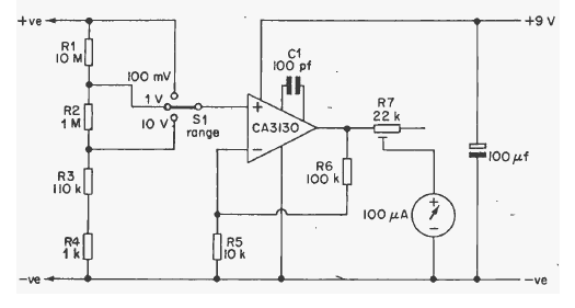 This circuit with the operational amplifier CA3130 was found in an English publication from 1977. The circuit does not need a symmetric power source and has 3 scales. Input resistors must be precision.