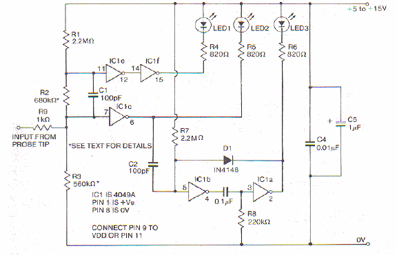 In the figure we have the CMOS logic test circuit developed with the 4049. The circuit activates three LEDs according to the level and status of the input.