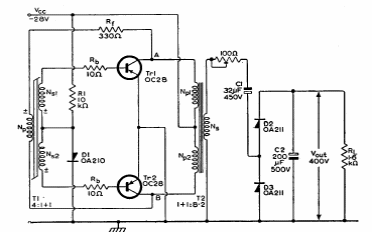 This voltage inverter was found in a 1960's Mullard manual. The transistors are from that time. No information about transformers is given. The maximum output current is on the order of 250 mA.