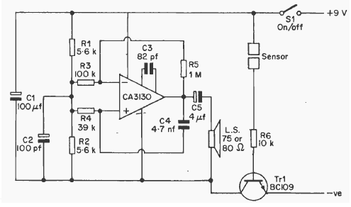 Using an operational amplifier with FET, this circuit was found in an English documentation from 1977. It can also be used as a moisture and leakage alarm.