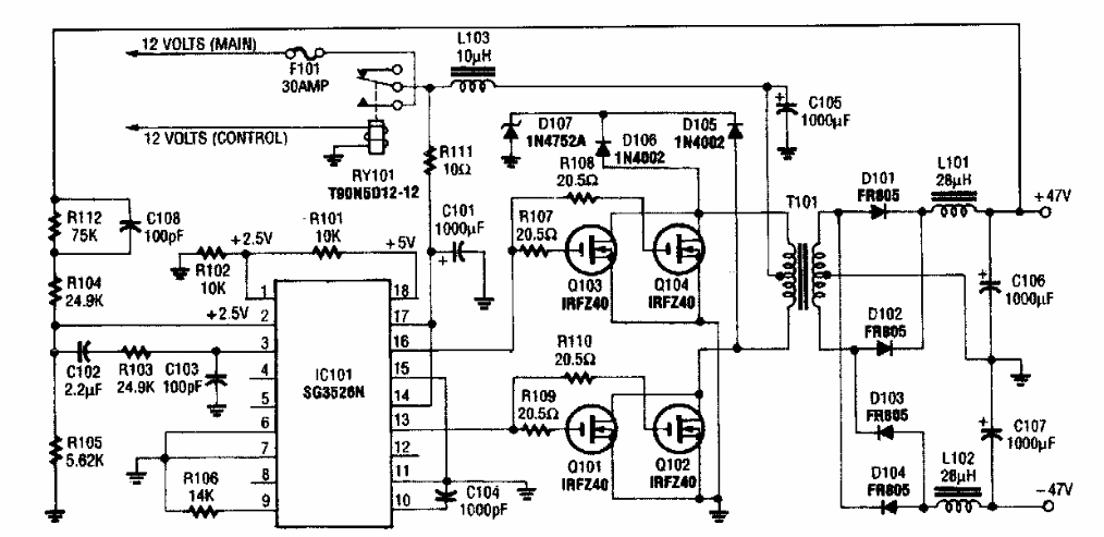 This power supply circuit for high power audio amplifiers was found in Radio Electronics from the 90's. Power MOSFETs admit modern equivalents. The output current is 5 A.