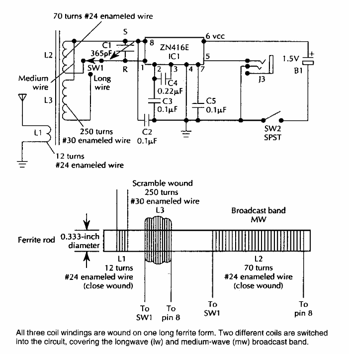 Found in documentation from the 1990s, this circuit uses an integrated radio from the time and has high impedance earphone listening.