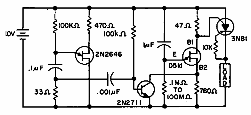 Found in General Electric documentation from 1967, this circuit makes use of an unusual semiconductor today, the 3N61. The circuit has the times given by the emitter capacitors of the unijunctions.