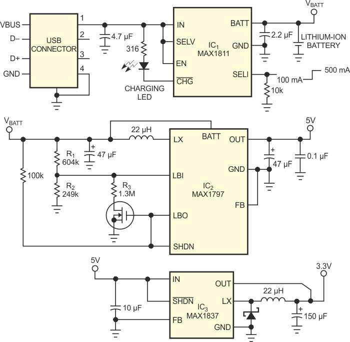 Based on Maxim's MAX1797, MAX1811 or MAX1937 integrated circuits, this circuit allows you to take power from the USB for projects with 5V and 3.3V logic. The maximum current is in the order of 500mA, depending on the version.