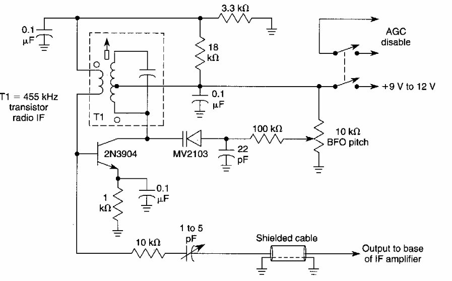 This circuit was proposed by an old American documentation for listening to SSB stations. The circuit makes use of a small old radio 455 kHz IF transformer.