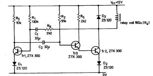 Found in a 1974 Ferranti transistor manual, this circuit drives a sensitive 12V relay in asymmetric cycles given by the capacitors. Capacitors can be changed.