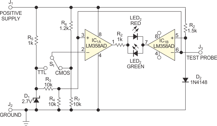Using the LM358 from Texas Instruments, this circuit uses LED indicators and can be powered with voltages of 5V or according to the analyzed logic.