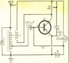 We found this circuit in Popular Electronics from February 1967. The transistor can be any type and L1 is made up of 30 +70 turns of 28 wire. L2 has 15 turns. The phone is high-impedance magnetic.
