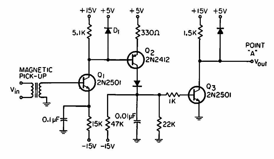 This circuit was taken from old American documentation. The circuit provides pulses obtained from a magnetic sensor for application in meters.