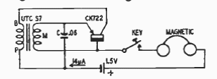This blocking oscillator circuit was found in a book by Rufus Turner from 1954. The circuit uses transistors of the time, and the phone must be high impedance magnetic.