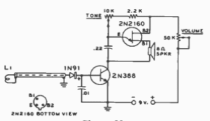This telegraphy broadcast monitor delivers a signal to a speaker from a unijunction transistor oscillator. The circuit is from a 1977 publication.