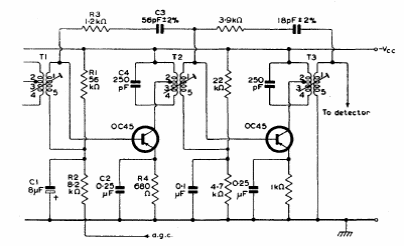 In the figure we have a step with two transistors for a 455kHz IF circuit. The circuit is from a 1960 Mullard transistor manual. The transistors are germanium.