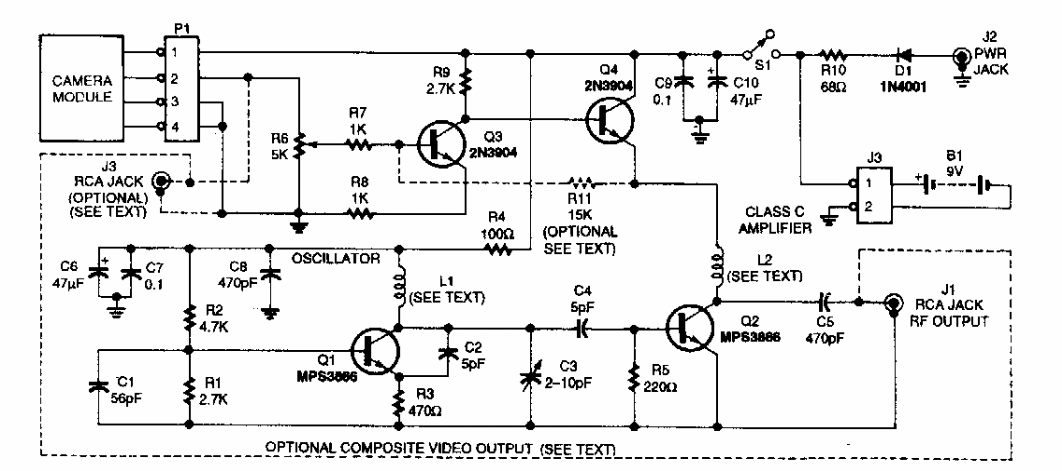 This small analog TV transmitter was found in an Electronics Now from the 90s. The range is around 20 meters, and the coils are according to the channel on which you want to receive the signal.