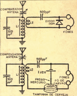 The name of the receiver found in a March 1957 Popular Electronics comes from the fact that the detector is made in a beer bottle cap. Receiver without active components is intended for medium waveband. Note: “cerveja” is the term for beer in Portuguese.