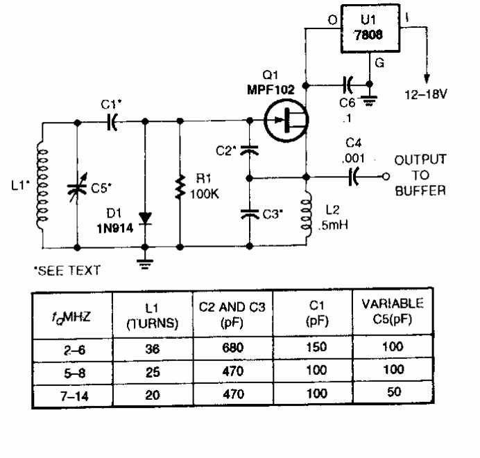 This circuit was found in a Popular Electronics from the 90's. The frequencies depend on the components indicated in the table next to the diagram.
