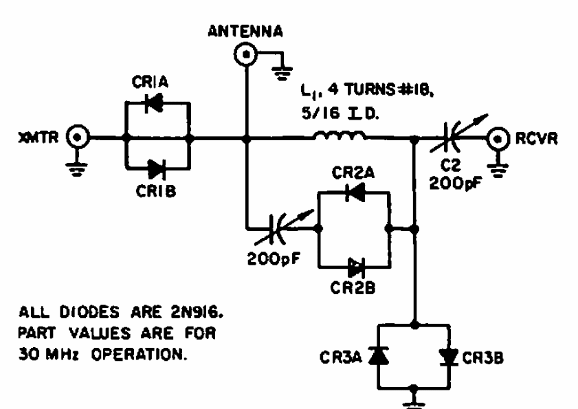 This circuit doubles the frequency of signals from 10 to 50 MHz. We found it in a 1969 Electronic Design. The components are from the period.